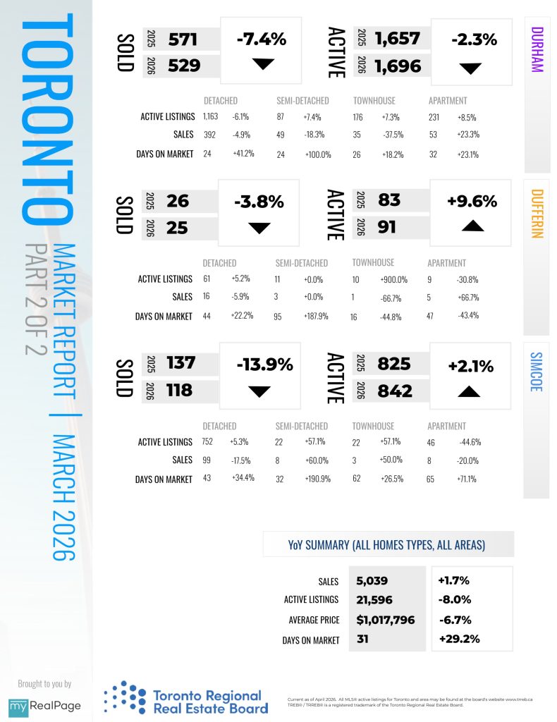 “Buyers continued to benefit from substantial negotiating power on price across major market segments in the last month. This explains why benchmark and average selling prices were down year-over-year. However, if market conditions continue to tighten, as they did in March, selling prices could start levelling off as we move through the remainder of 2026,” said TRREB Chief Information Officer Jason Mercer.